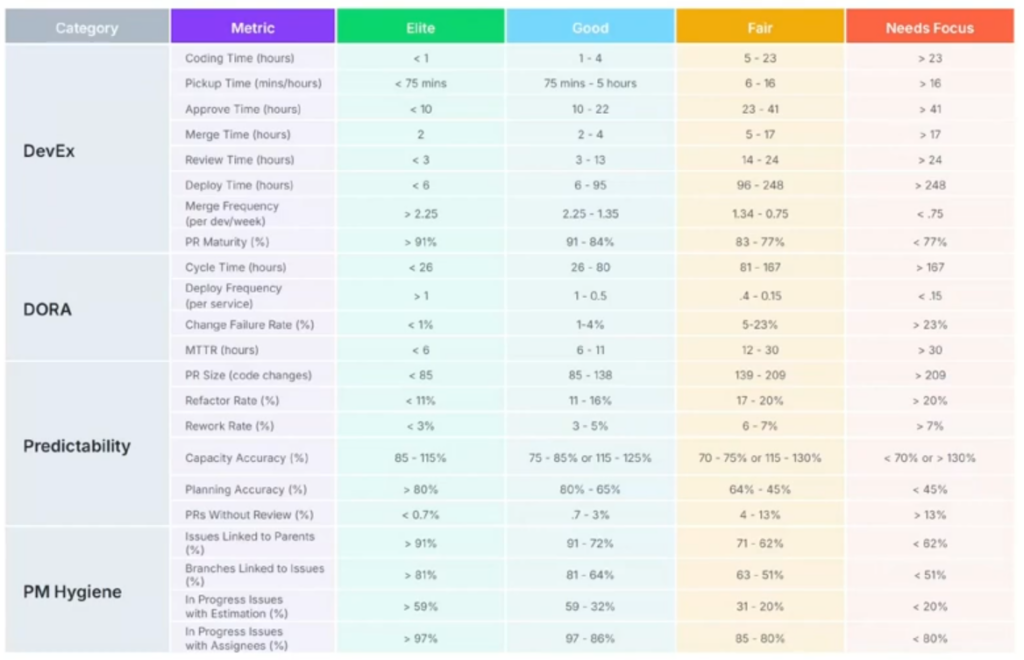 • Deploy Time (hours) – how many hours it takes to deploy after merging to the main branch. Elite teams can do it in less than 6 hours. This reflects Lead Time for Changes from DORA.